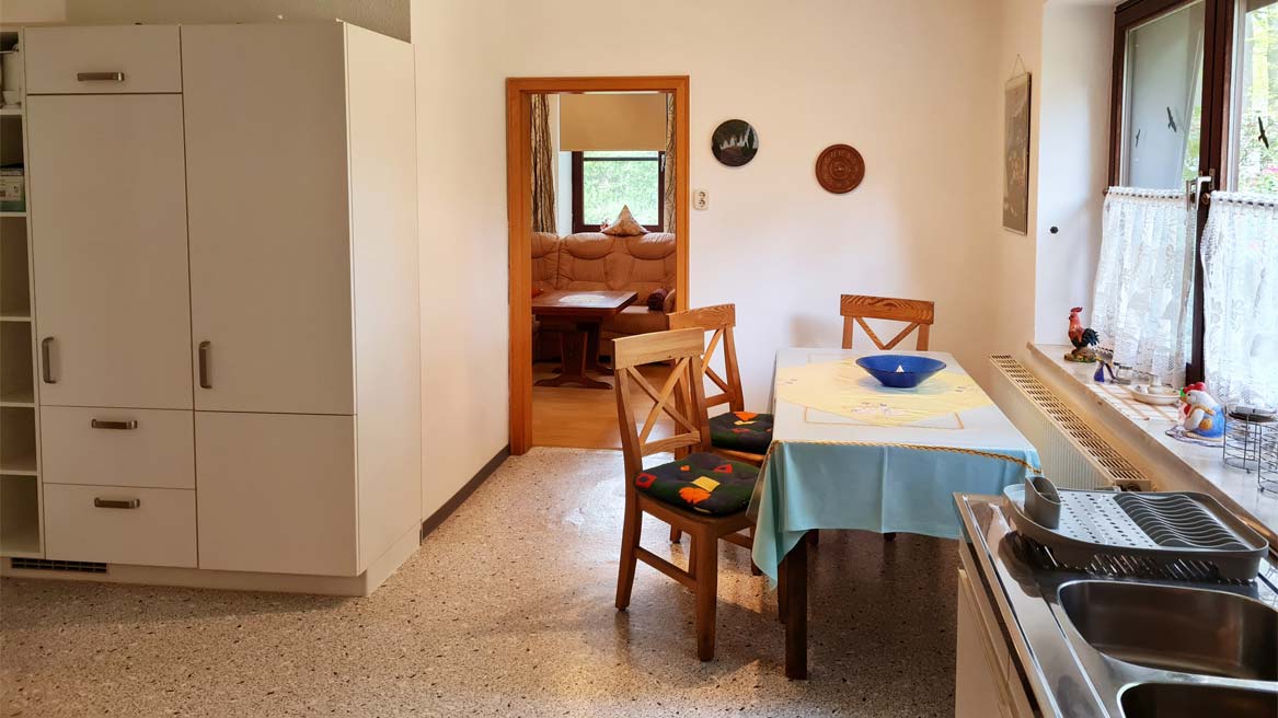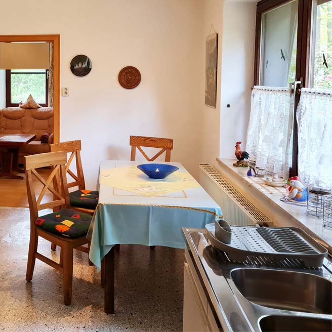 Die Ferienwohnung befindet sich auf einem parkähnlichen Grundstück, umrahmt von Tannen, Eichen und Buchen, in ruhiger ländlicher Lage. Dennoch ist die nächste Einkaufsmöglichkeit keinen Kilometer entfernt.