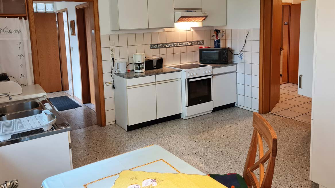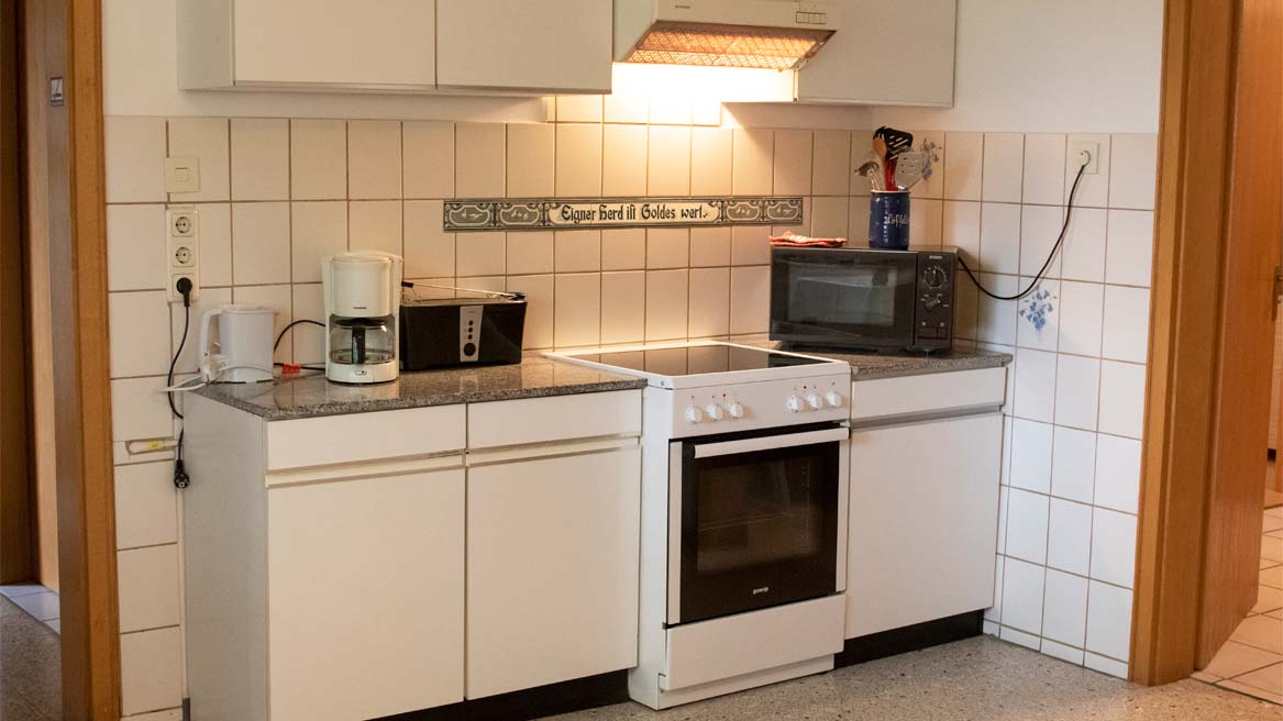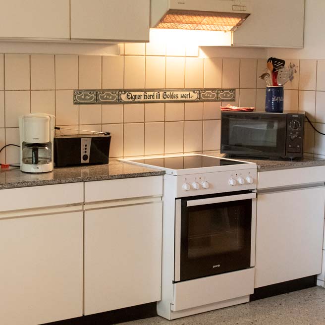 Geschirr, Besteck, Gläser, diverse Küchengeräte, Oberbetten und Kopfkissen sind für die angegebene Personenzahl vorhanden.